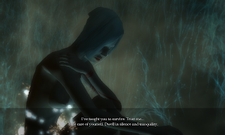 Most of the information about both the game’s fictional world and the game mechanics come from NPCs, especially the Sisters. But the information is invariably cryptic and vague, and frankly, some NPCs just plain lie to you. Aya, one of the Sisters, tells you “Oh, guest… You really do not comprehend…”, which sums up the situation quite nicely. In another great stroke of minimalist design, the main character is mute, so he cannot really ask any questions. He has to rely on a dissonant fugue of other characters’ voices who may or may not be honest with him.